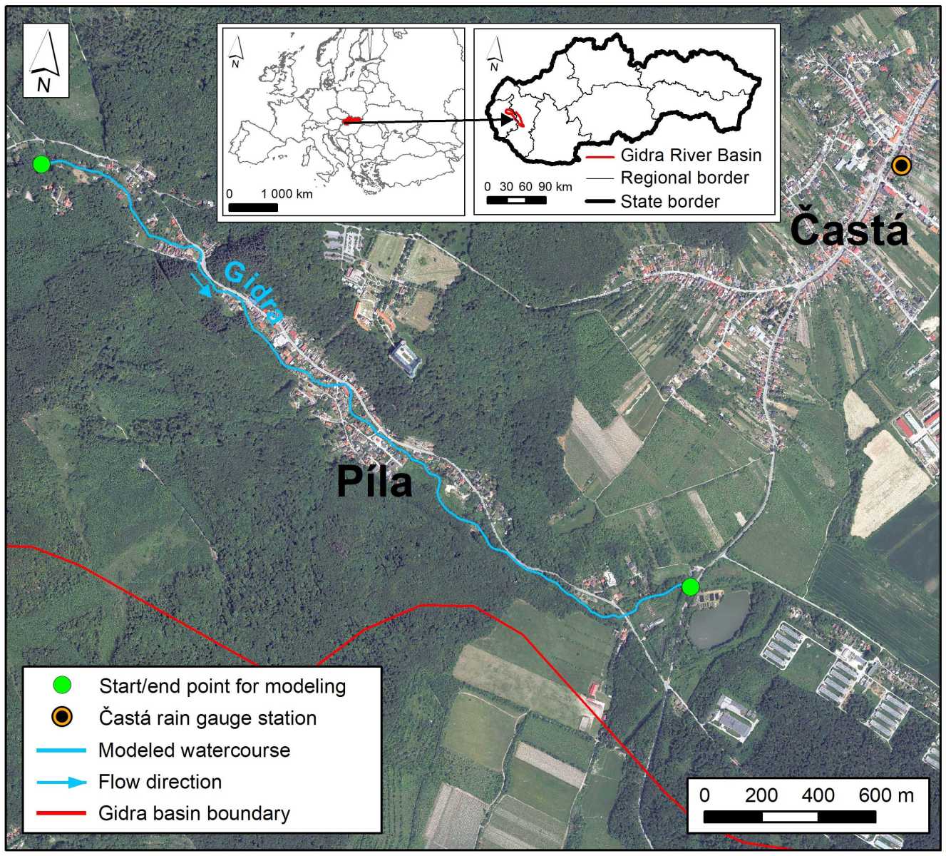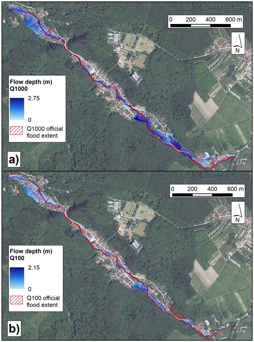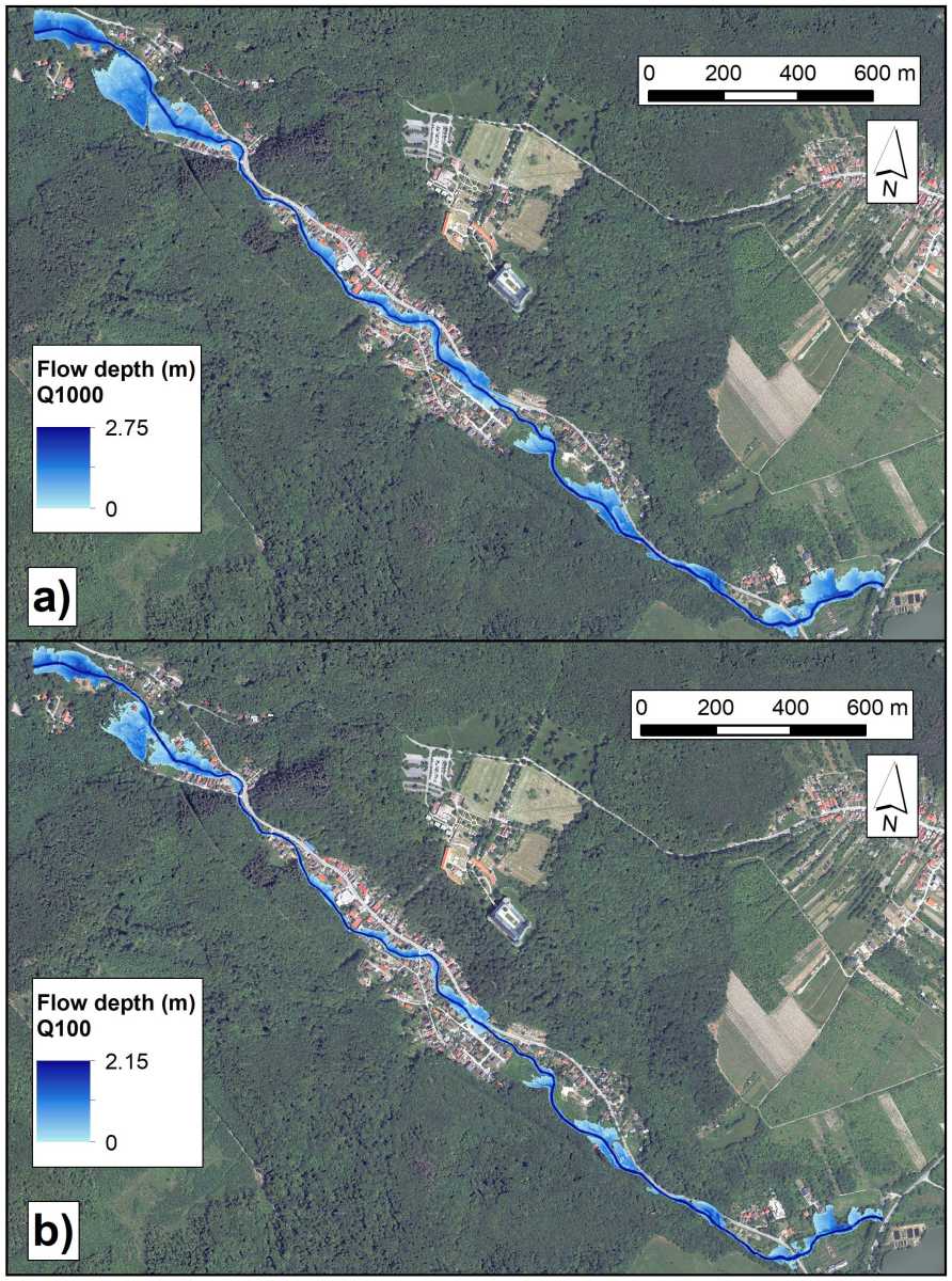 V článku sa autori zamerali na porovnanie hydraulického prístupu s použitím 1D MIKE+ modelu, zatiaľ čo GIS prístup predstavoval model Height Above the Nearest Drainage (HAND). Výskumnou otázkou bolo, či je HAND model vhodný na modelovanie fluviálnych povodní a či je porovnateľný s 1D hydraulickým modelom v študovanom území, ktorým bol 3,1 km dlhý úsek rieky Gidra. Na určenie maximálnych prietokov so 100 a 1000-ročnou dobou opakovania bol použitý zrážkovo-odtokový prístup pomocou modelov STORAGE a COSMO4SUB. Presnosť HAND modelov v porovnaní s 1D hydraulickými MIKE+ modelmi bola vyhodnotená pomocou šiestich metrík: Critical Success Index, F1-score, Bias, Precision, Recall a Overall Accuracy. Na základe výsledkov HAND model mierne podhodnotil hydraulicky modelovaný rozsah povodne v prípade oboch povodňových scenárov s hodnotami Bias metriky 0,84 (Q1000) a 0,87 (Q100). V závere článku autori konštatujú, že rozsah povodne modelovaný HAND modelom pre študovaný úsek rieky Gidra mal prijateľnú presnosť v prípade oboch povodňových scenárov v porovnaní s 1D hydraulickým modelom. Použitie HAND modelu je výhodné najmä na operatívne alebo predbežné zmapovanie fluviálnej povodňovej hrozby z dôvodu nižších nárokov na vstupné údaje a samotnú tvorbu modelu v porovnaní s hydraulickými modelmi.