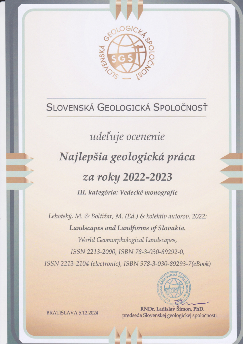 Monografia Milana Lehotského a Martina Boltižiara získala ocenenie za najlepšiu geologickú prácu v kategórii Vedecké monografie. Toto ocenenie im bolo udelené počas 22. seminára Slovenskej geologickej spoločnosti, ktorý sa konal 5. decembra 2024 v Bratislave.