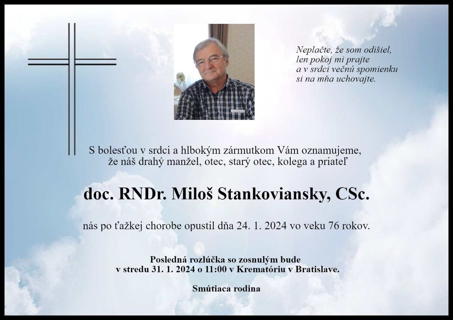V stredu 31. januára 2024 o 11:00 sme sa s ním rozlúčili v bratislavskom Krematóriu.